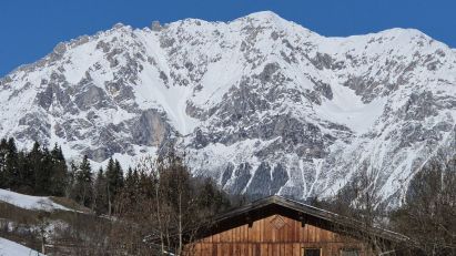 Zackig ragen die steinernen Gipfel in den Himmel und drängen sich dicht aneinander. Anführer der schroffen Bande ist der Dachstein mit seinen 2.995 Metern. Rundherum verschneite Wälder, frische