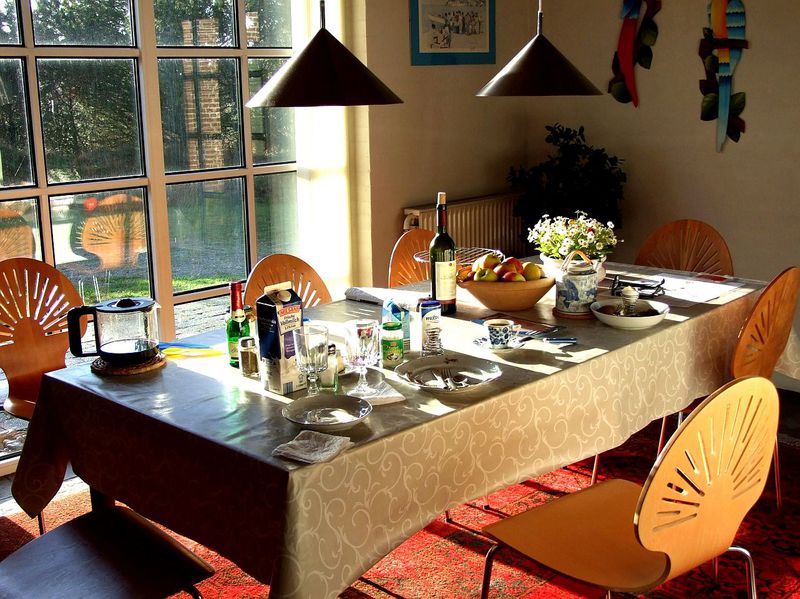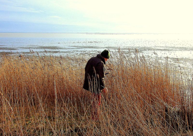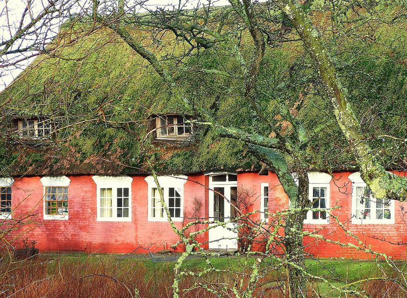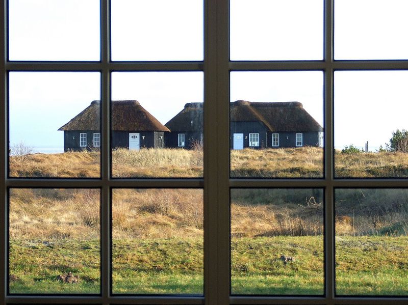 Unser Haus liegt in zweiter Reihe auf der Wattenmeerseite – das macht den Aufenthalt so reizvoll. Schon beim Frühstück geht der Blick durch die bis zum Boden reichenden Sprossenfenster in die Weite – rechts und links ragen aus hohen Grasbüscheln kräftig bunt gestrichene, reetgedeckte Dänenhäuser, - bei uns sagen wir Friesenhäuser dazu - in den Morgenhimmel. Gleich dahinter, fünf Minuten Fußweg durch Schilf und Gras, genießen wir unseren Morgenspaziergang am Watt in einem Licht zum Niederknien.