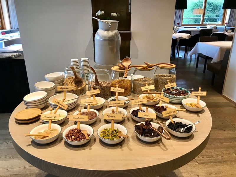 Marmeladen, Obstsäfte – alles steht bereit. So ist man gestärkt für eine weitere Aktivität, eine Wanderung mit dem hoteleignen Wanderführer.