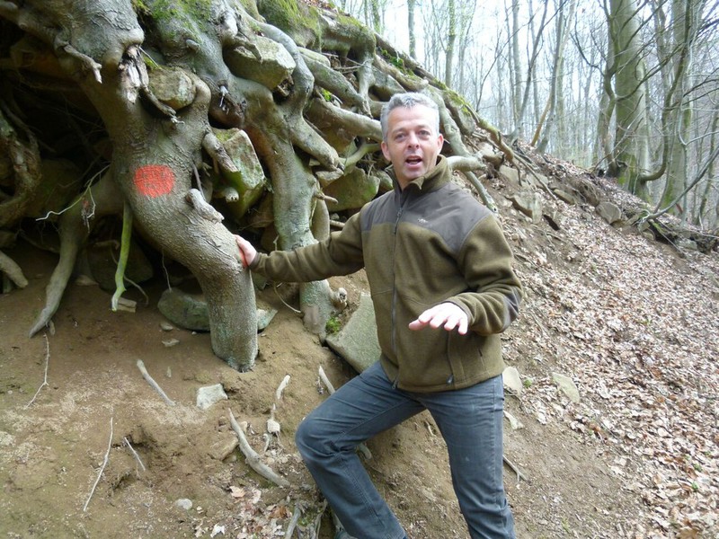 Adelheid. Wir kommen zu einem großen Stein, der wie ein Tor geformt ist. „Solche Steine galten früher als ‚Abstreifsteine', hier konnte man schlechte Energien los werden. Und dahinter, im