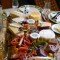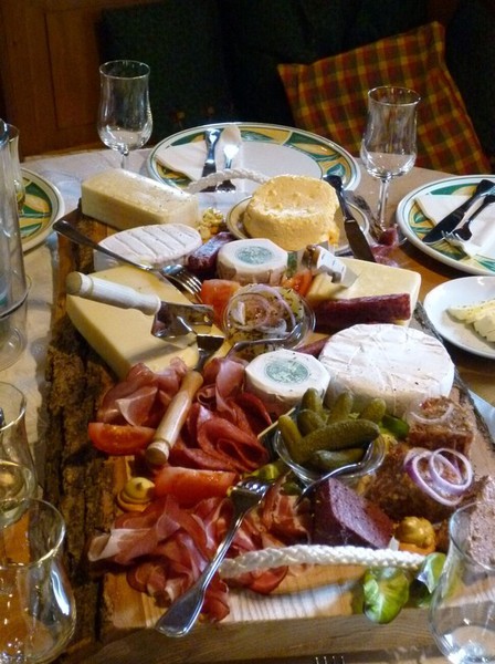 Kartoffelsoufflé mit Marktgemüse. Das Abendessen fängt mit einem Salatbüffet an. Bei Vorspeise, Suppe und Nachtisch kann man immer zwischen zwei Möglichkeiten wählen. Das Käsebüffet mit Allgäuer Käse