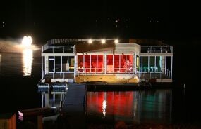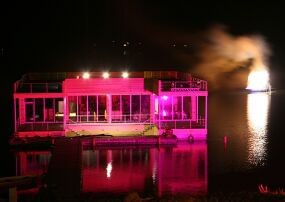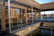 Die ungewöhnliche Konstruktion der schwimmenden Seesauna, getragen von Pontons, ist Teil des ausbalancierten Gesundbrunnen-Konzeptes von Martin Weiss. "Wasser in seiner schönsten Form" das Motto ist