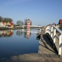 Mitten in der Hafeneinfahrt trohnt der 20 Meter hohe Leuchtturm. Um zum Rheinsberger See zu gelangen muß man erst einmal Brücken und Stege passieren, denn das Wahrzeichen des Dorfes ist mit dem