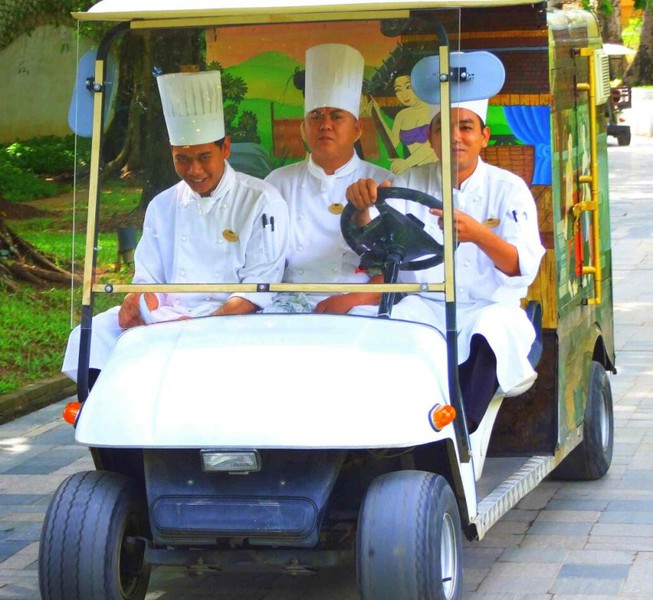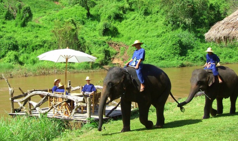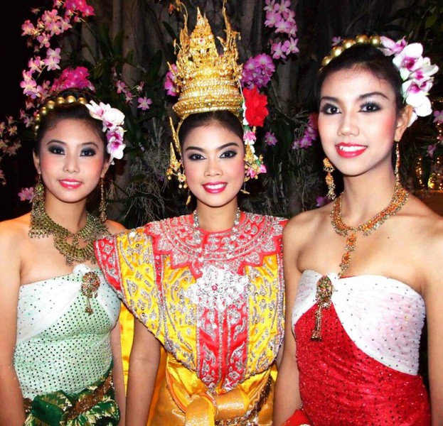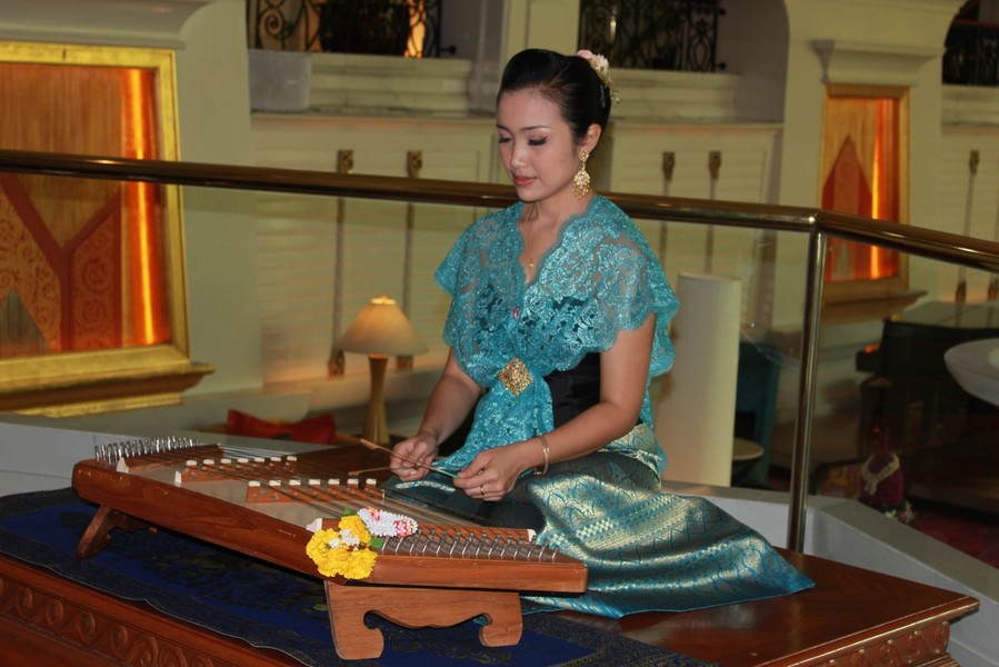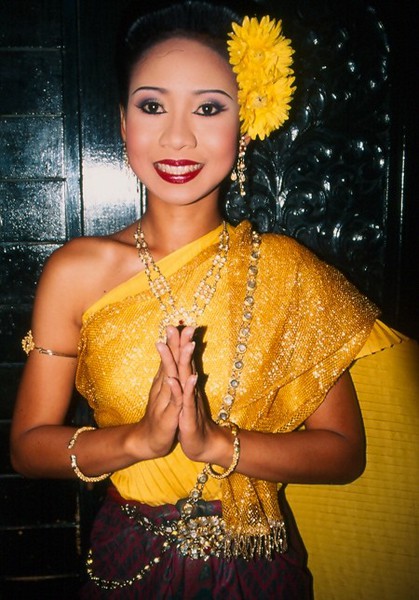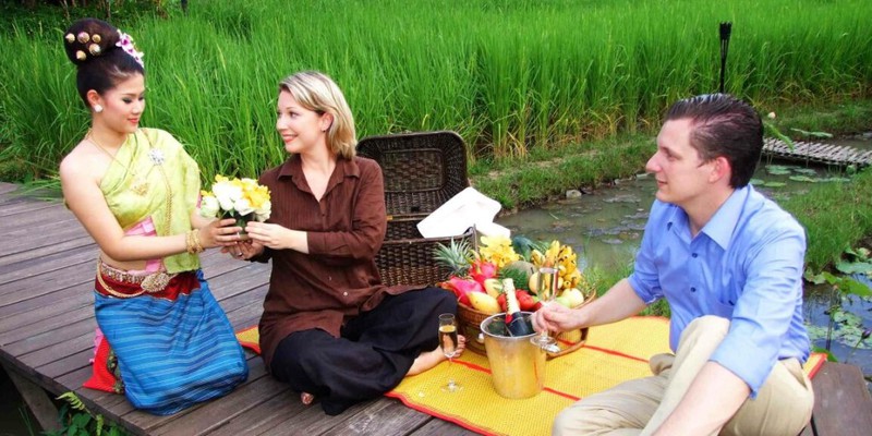 Auf der großzügigen Terrasse aus blankpoliertem Teakholz wird es Abend. Im Licht flackernder Kerzen und Fackeln wird ein thailändisches Menü mit unzähligen Gängen serviert. Man speist mit Blick auf Reisfelder, Lotusblütenteiche und auf die anmutigen Bewegungen der Tänzerinnen, die das Dinner begleiten. Beleuchtete Wege führen zu den gegenüberliegenden Gästepavillons im Thaistil. Davor und dazwischen laufen - man meint sie schweben - schmale, zarte dienstbare Geister in farbigen Sarongs. Mit dieser Kulisse vor Augen, glaubt man sich im Märchen oder wenigstens wie im Film.