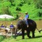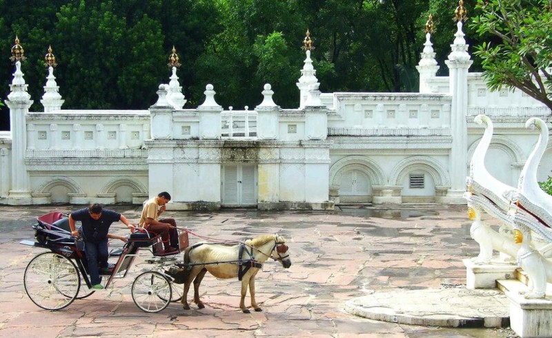 Unter uns das alte, koloniale Chiang Mai im Zentrum der an prächtigen Tempeln reichen Stadt, der zweitgrößten Thailands. Elefanten trotten durch stille Gässchen an hübschen Teakholzhäusern, bunten Geisterhäuschen und Tuk-Tuks vorbei. Mönche in safrangelben Gewändern laufen eiligst in ihre Tempel.