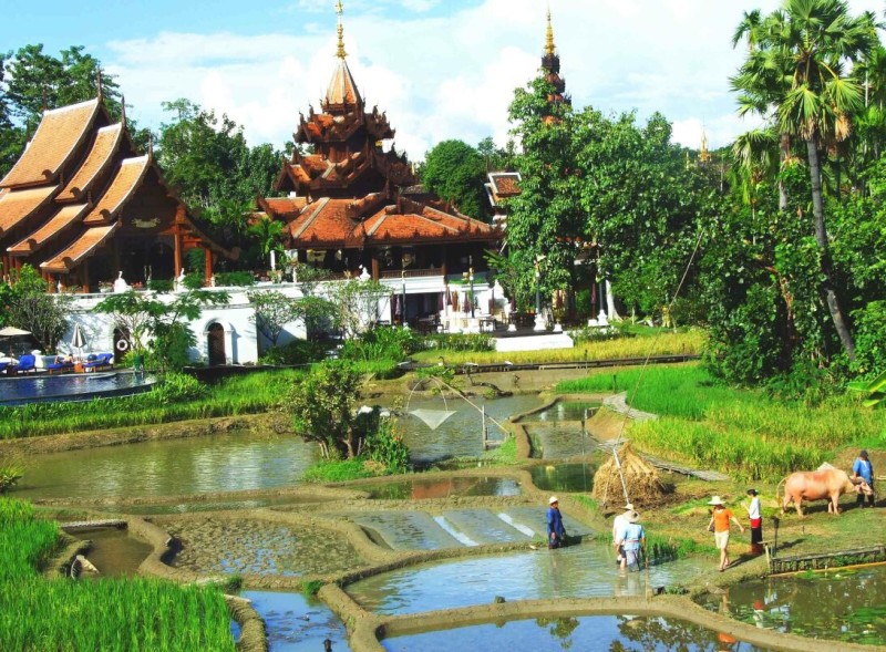 Der Gesamteindruck des Hideaways Mandarin Oriental Dhara Devi, was übersetzt soviel wie „Sternenschönheit" heißt, ist überraschend, überwältigend und wird seinem Namen voll gerecht. Es ist eine Kreuzung zwischen Resort und luxuriöser Reisfarm inmitten unberührter Landschaft etwas außerhalb gelegen von Chiang Mai.. Eingebettet in Terrassenfelder, in denen hauseigene Wasserbüffel und Reiher das Ambiente des Agraridylls vervollkommnen sollen. Auf den Teakveranden sieht der Gast beim 5-o'clock-Tea den Bauern zu, wie sie Reis bewässern, Reis ernten, Beete säubern. Authentisch? Nicht ganz: Zu exakt die Wege zwischen den Villen, zu perfekt abends das Lichterspiel.