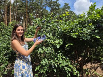 Die Heidelbeersträucher in der Selbstpflücke in Klaistow gehören zu den ältesten Beständen der Familie Winkelmann. Hier hängen die Beeren in dichten Trauben an den Zweigen, und pro Strauch können die Gäste bis zu 5 Kilogramm ernten. Die blauen Powerbeeren werden von Juni bis September geerntet, wobei die Erntetage je nach Wetterlage variieren. Zuerst reifen die Sorten ‚Duke‘ und ‚Reka‘, gefolgt von ‚Draper‘ und ‚Bluecrop‘. Später im Jahr kommen die Sorten ‚Elisabeth‘ und ‚Liberty‘ hinzu. Frische Heidelbeeren werden auf dem Hof in Klaistow sowie an verschiedenen mobilen Verkaufsständen und im Lebensmittel-Einzelhandel angeboten. Besucher des Erlebnishofs haben zudem die Möglichkeit, die Beeren direkt im Kuchen der Hofbäckerei oder in vielfältigen Gerichten im Hofrestaurant zu genießen. Der Hofladen bietet ein umfangreiches Sortiment an hausgemachten Heidelbeerprodukten: Heidelbeerlikör, Heidelbeer-Gin, Fruchtaufstrich, Sirup, Tee, Bonbons, Nudeln, Limonade, Wein und Secco. Besonders beliebt ist der Heidelbeer-Direktsaft. In jeder 0,75-Liter-Flasche steckt das Saftäquivalent von etwa einem Kilogramm frischer Heidelbeeren, ganz ohne Zusätze, Zucker oder andere Zutaten. Seit zwei Jahren gibt es eine Kooperation mit der Hemme-Molkerei in der Uckermark. Heraus kommt der köstliche Heidelbeer-Joghurt mit Klaistower Heidelbeeren.
