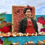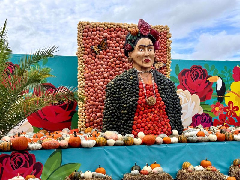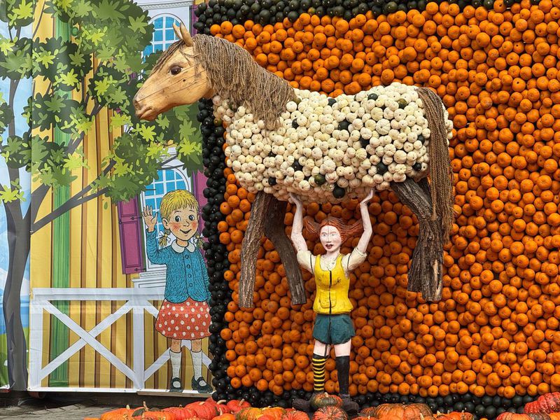 Unter dem Motto „Powerfrauen“ sind überlebensgroße Figuren, von Pippi Langstrumpf bis Frida Kahlo, mit tausenden Kürbissen gestaltet.