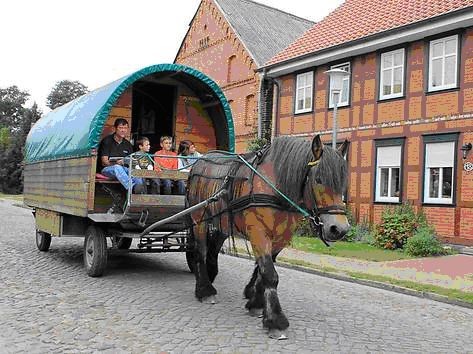 Ein Hü ertönt vom Kutscher, denn wir fahren mit einem Wohnwagen durch die Straßen. Wir werden von einem Pferd gezogen. Der Wagen holpert über Waldwege, Sandwege und Steinwege. Die Reifen rattern und wir haben nur noch einen Tag Zeit um anzukommen. Aber wir haben noch mindestens 36 kmvor uns. Auf einmal halten wir an. Unserem Pferd Rosi ist die Kraft ausgegangen. Wir mussten eine Rast einlegen und sind noch 30km von unserem Ziel entfernt. Die Autos zischen an uns vorbei. Wir haben Rosi ausgeschirrt, dann haben wir ihr Wasser, Karotten und Heu gegeben. Wir können erst in der Dunkelheit weiter fahren, wir kommen um 21:30 Uhr bei dem Besitzer an.